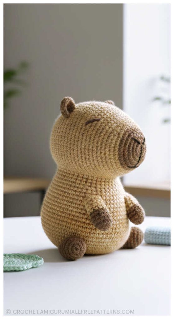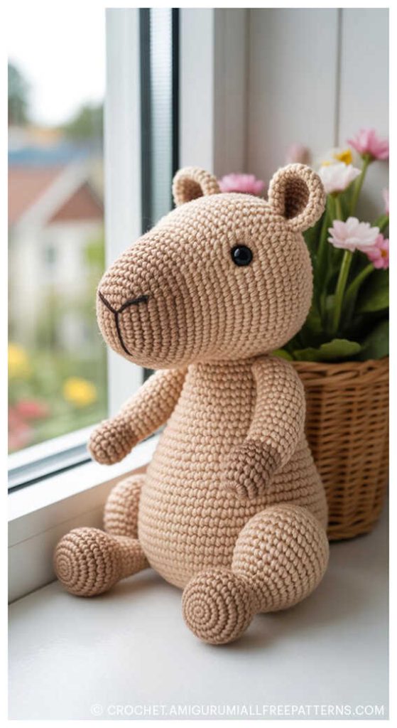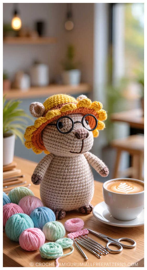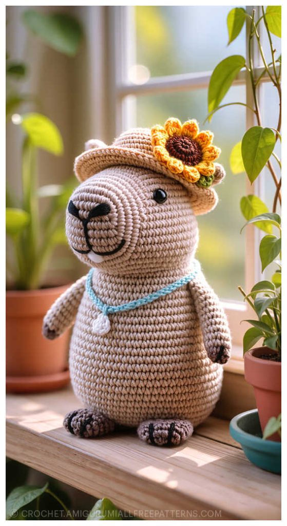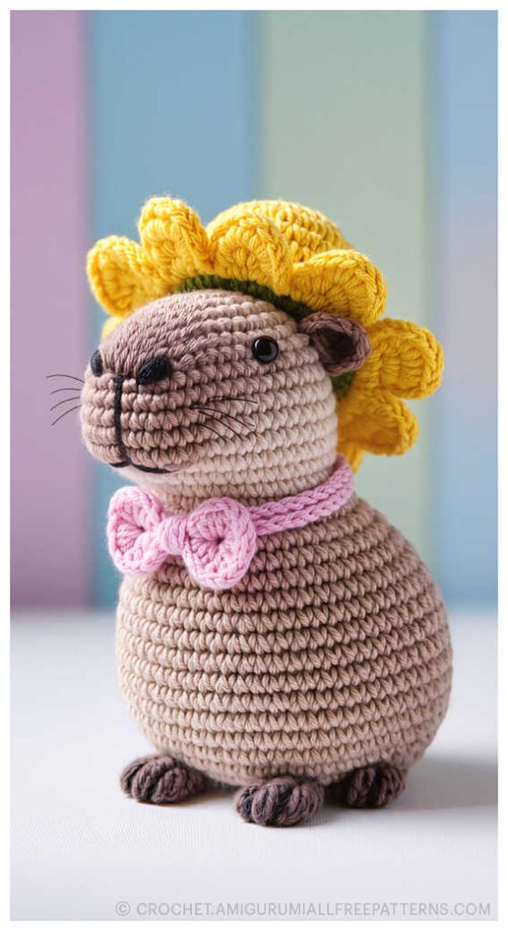 If you’re looking for a cute and cozy crochet project to brighten your day, the Sunflower Crochet Capybara Free Amigurumi Pattern by Bearybearnita Design (YouTube) is the perfect choice! Designed by the talented Phạm Hiền Hạnh, this adorable capybara with its sunflower hat will melt your heart. The pattern is step by step and beginner friendly, making it an ideal project for anyone who loves nature-inspired amigurumi. Using chunky yarn, a 2.5mm crochet hook, 2mm safety eyes, black embroidery thread, fiberfill, and yarn needles, you’ll create a soft, huggable capybara that looks straight out of a sunny meadow.