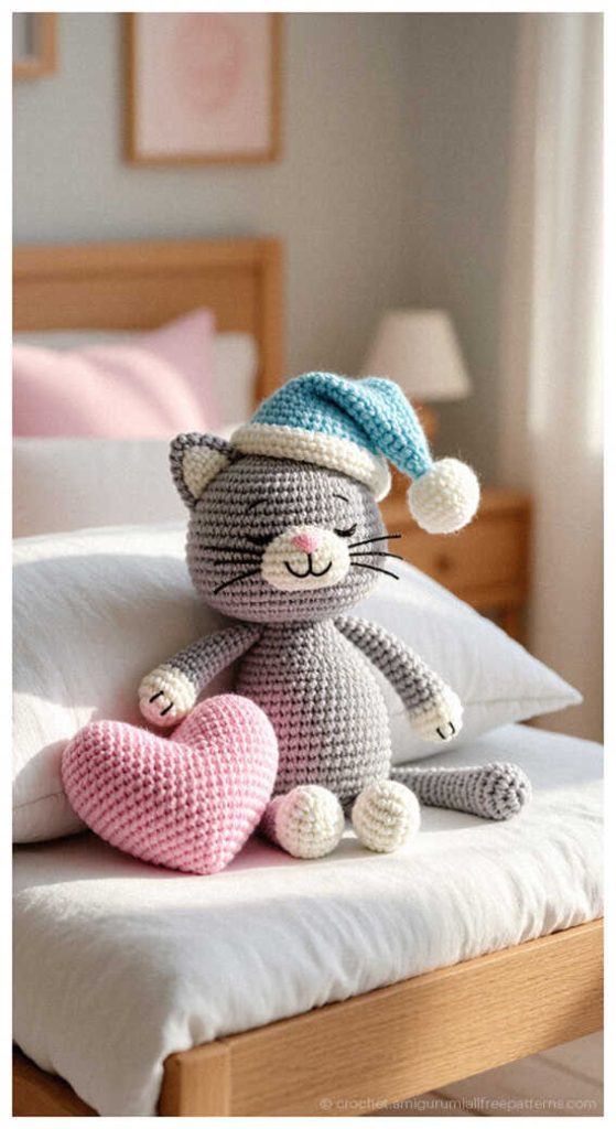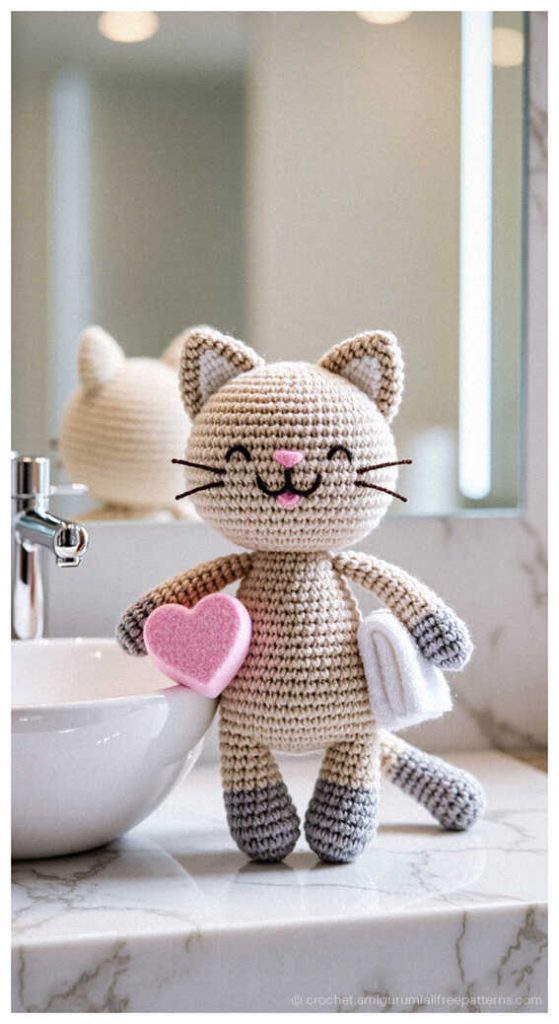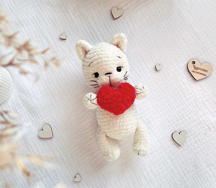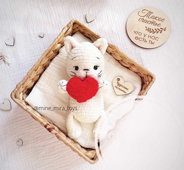 This free cat with heart amigurumi pattern is designed and photographed by @mine_mira_toys. With its soft velour texture and delicate embroidered details, this little crochet cat makes a charming option for DIY Crochet Gift Ideas, Valentine decor, or meaningful handmade surprises. You will also find inspiring cat with heart amigurumi ideas shared at the end of the pattern, and we sincerely thank @mine_mira_toys for this adorable design. It also pairs beautifully with a cute seal amigurumi for small themed gift sets.